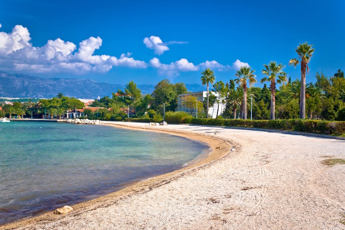 A family-friendly beach, with planted trees offering shade and with easy access to Novalja's amenities.