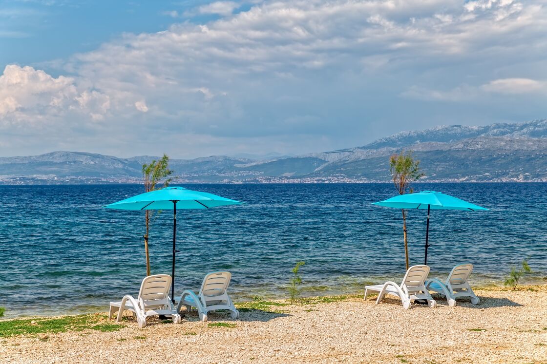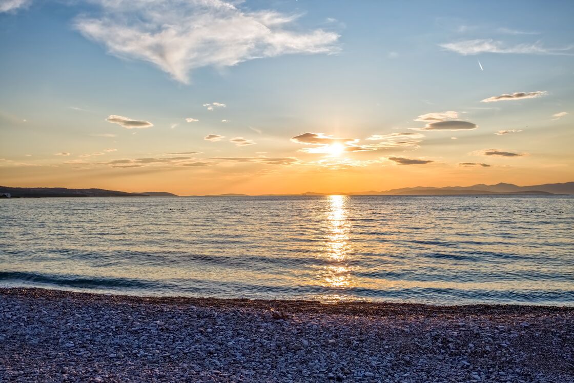 It’s a small pebble beach located right next to Tri Mosta beach. There is a windsurfing school located on the beach. The beach has no natural shade, but umbrellas can be rented. Refreshments can be found in cafes on the neighboring beach.
